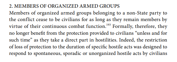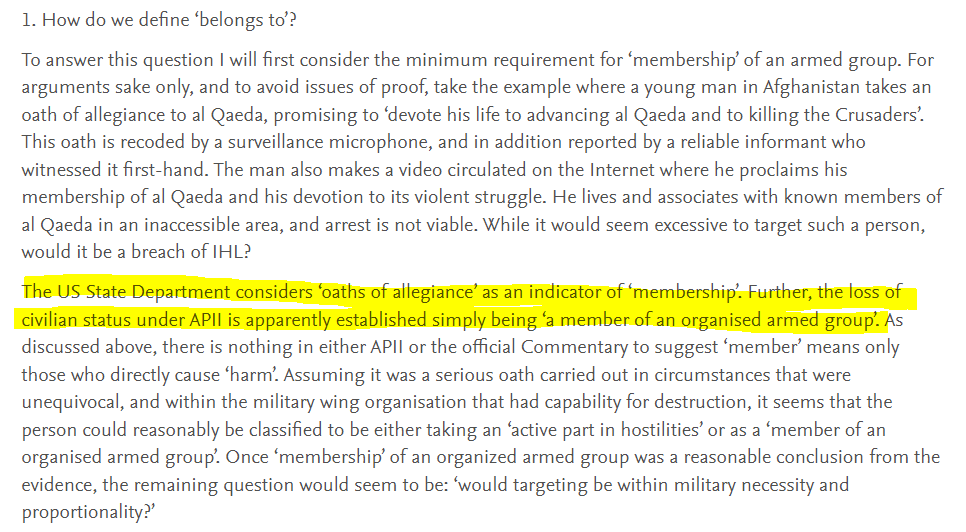 For the US, for instance, simply swearing an oath to al-Qaeda was enough to turn someone into a "member" and lose all civilian protections. Similarly, are non-combat "members", members? Is a Hamas cook or driver "not a civilian" anymore? see here: papers.ssrn.com/sol3/papers.cf…