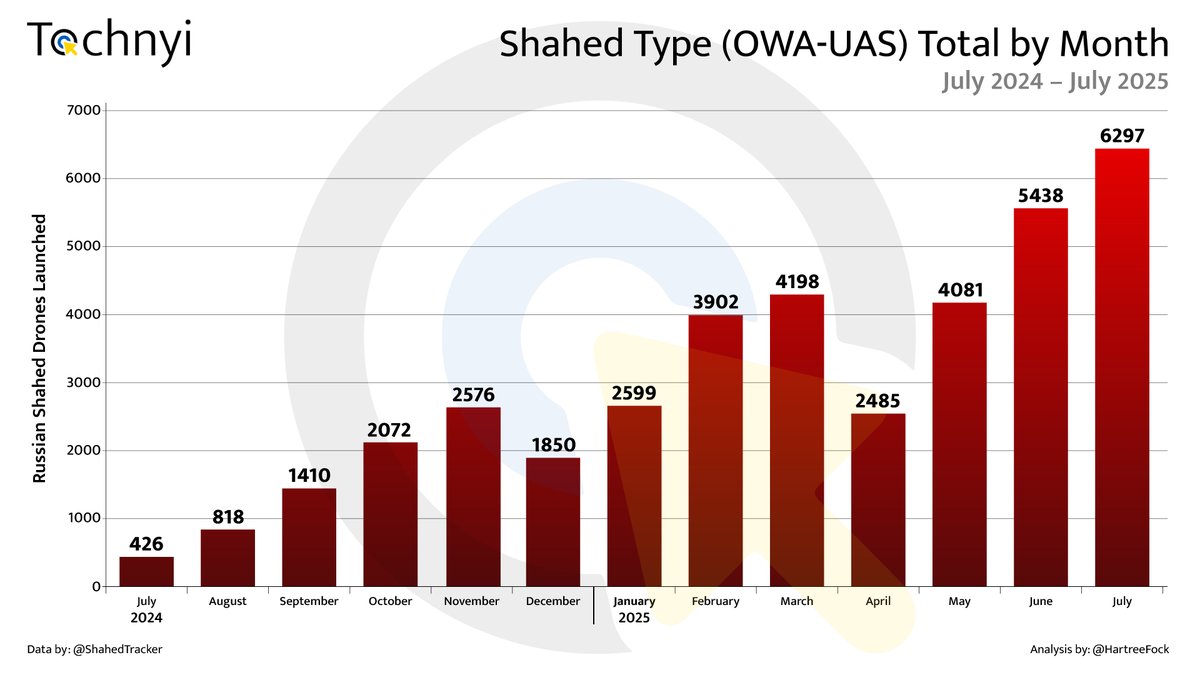 2. Over the past 5 months, Russia has tripled its use of Shahed-type drones, now averaging 103 launches per day. Ukraine hasn’t had a single day without attacks. In April 2025, Russia launched 2,485 Shaheds. By July, 6,297. That’s a 1,378% increase compared to July 2024.