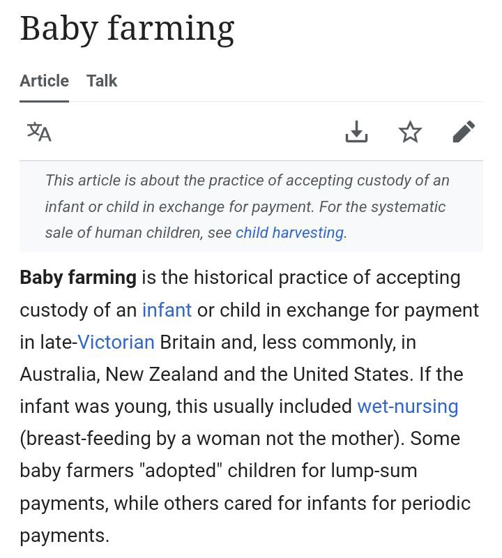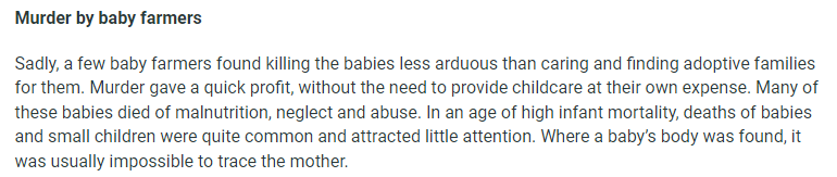 1. 'Baby farming is still in use today to describe a similarly dark but different business model. Formally known as “child harvesting”, it refers to the systematic sale of human children, typically for adoption by families in the developed world where childless couples might be