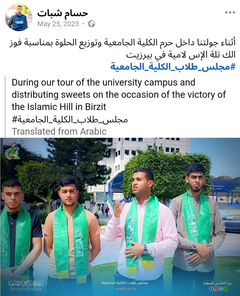 Hossam is less shy about his role on the Municipal Youth Council of Beit Hanoun in Gaza, where, among other things, he meets with Hamas police and hands out candies in honor of the Hamas student bloc winning student body elections at Birzeit University. How sweet!