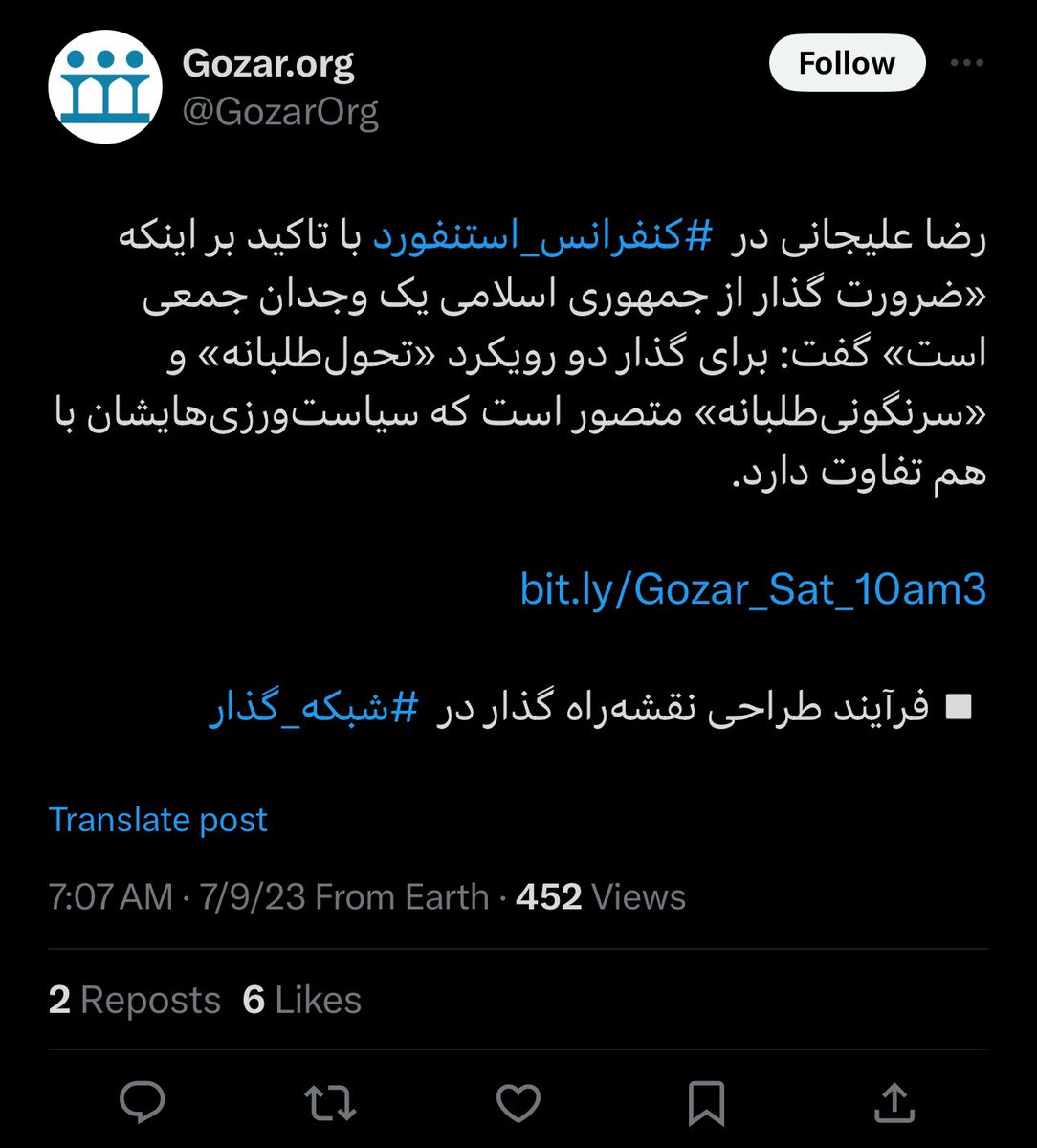 بعد از جنبش فراگیر براندازانه ۱۴۰۱، عدم مشروعیت نظاماسلامی و لزوم برافتادن جمهوریاسلامی به امری غالب در آگاهیجمعی ایرانیان تبدیل شدهاست. تلاش برای برافتادن هر حکومتی—بنابر هر تعریف معقولی—کاری کاملا ”سیاسی“ محسوب میشود. بازتعریف مخالفت با جمهوریاسلامی در پوشش به اصطلاح غیر«سیاسی»، «مدنی»، و «تخصصی»، چیزی نیست جز تلاش برای کمرمق کردن مقابله موثر با جمهوریاسلامی. هیچ بعید نیست که در سالها و یا حتی ماههای آتی شاهد ”تعامل“ (لااقل بخشی از) نظامجمهوریاسلامی با این طیف از «مخالفان» «فرهیخته» نیز باشیم؛ در اینصورت دوباره شاهد کمک این «فرهیختگان» به تلاشی دوباره برای «مشروعیت»تراشی خارجی و داخلی جمهوری اسلامی خواهیم بود.