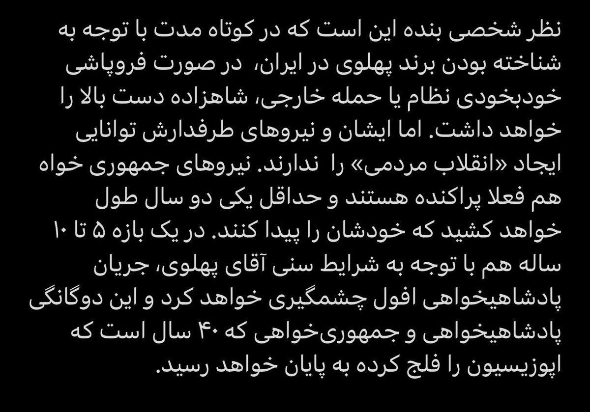 در بهترین حالت برخی از این «فرهیختگان»، ضمن اذعان به قوت مخالفان جمهوریاسلامی نزدیک به @PahlaviReza —که بیشک از مهمترین و قدیمیترین مخالفان جمهوریاسلامیهستند—تنها منتظرند تا گذر زمان موجب «افولچشمگیر» ایشان و قدرتیابی جریانات مورد وثوق این «فرهیختگان» شود!