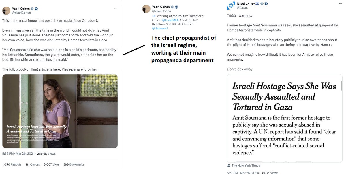 more will come out about Amit Sousanna, the alleged victim of sexual violence, in the coming days and weeks. I expect it will be another Sapir, Shari Mendes, Yossi Landau. Hilariously the NYT tries to portray her as sympathetic to Palestinians to add credibility. They are experts
