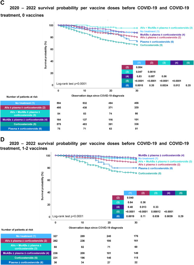 6) Fig. Survival probability per diagnosis semester, vaccination status, and COVID-19 treatment. A