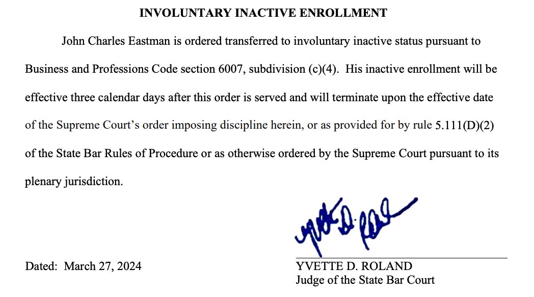 Though Eastman cannot practice law anymore, he is NOT technically disbarred yet. This is the start of a process leading to the CA Supreme Court. Eastman can (and surely will) appeal Roland's ruling. politico.com/news/2024/03/2…