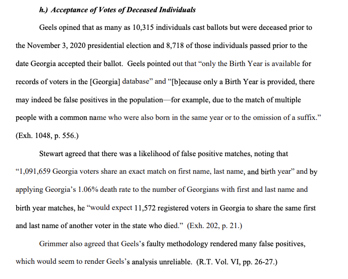1) Deceased voters in Georgia: The data Eastman used to claim 10,315 dead people voted did not account for high likelihood of false positives. politico.com/news/2024/03/2…