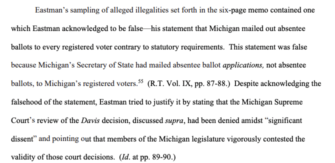 5) Eastman claimed in his infamous 6-page memo that Michigan mailed out absentee ballots to every registered voter, eliding the fact that what was maield were *applications* for absentee ballots, not ballots themselves. politico.com/news/2024/03/2…