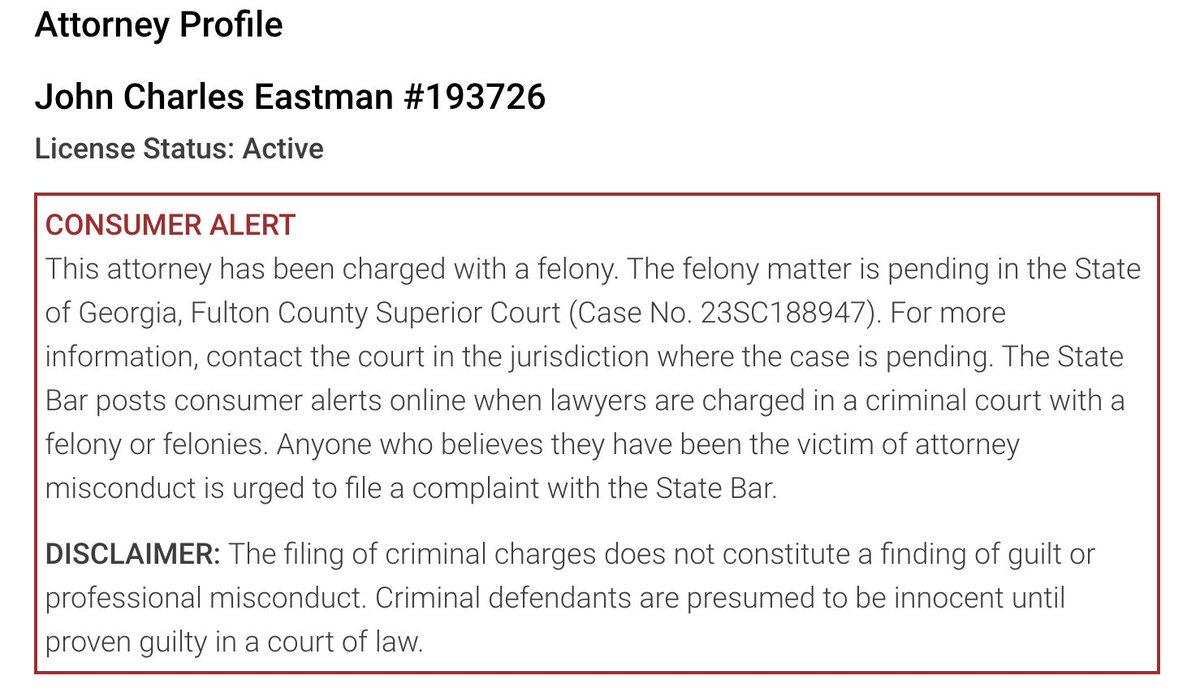 UPDATE: John Eastman's official status with the California bar has been updated to reflect his inability to practice law in California: apps.calbar.ca.gov/attorney/Licen…