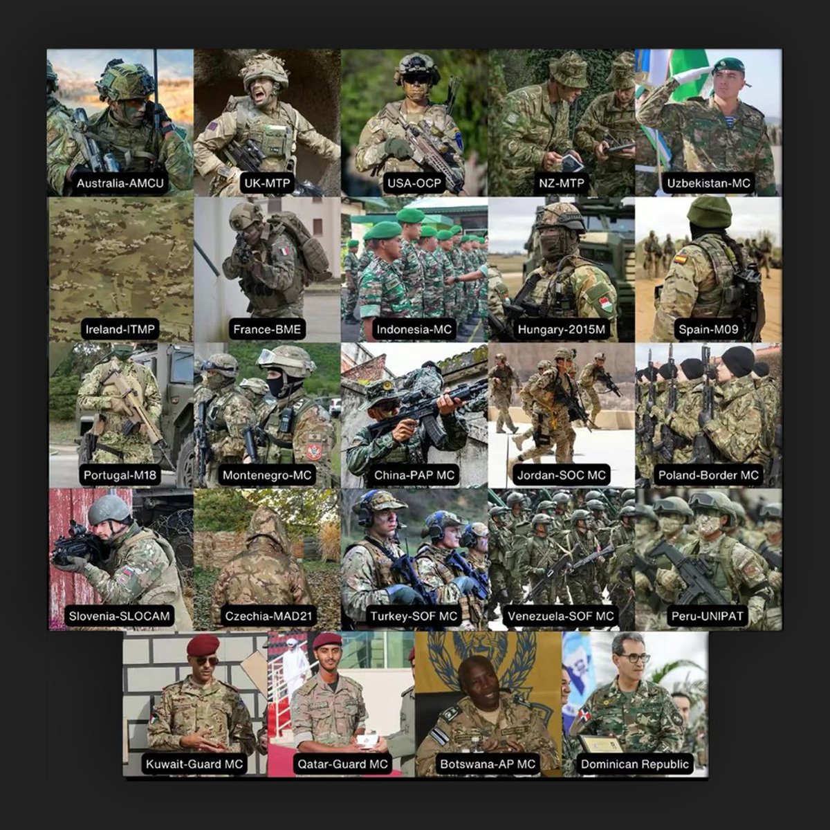 4/8 However, certain armies have special uniforms for their elite units, so certain SOF might use a Multicam while their conventional peers might just stick with their traditional camouflage. Russia and Sweden match perfectly with this example.