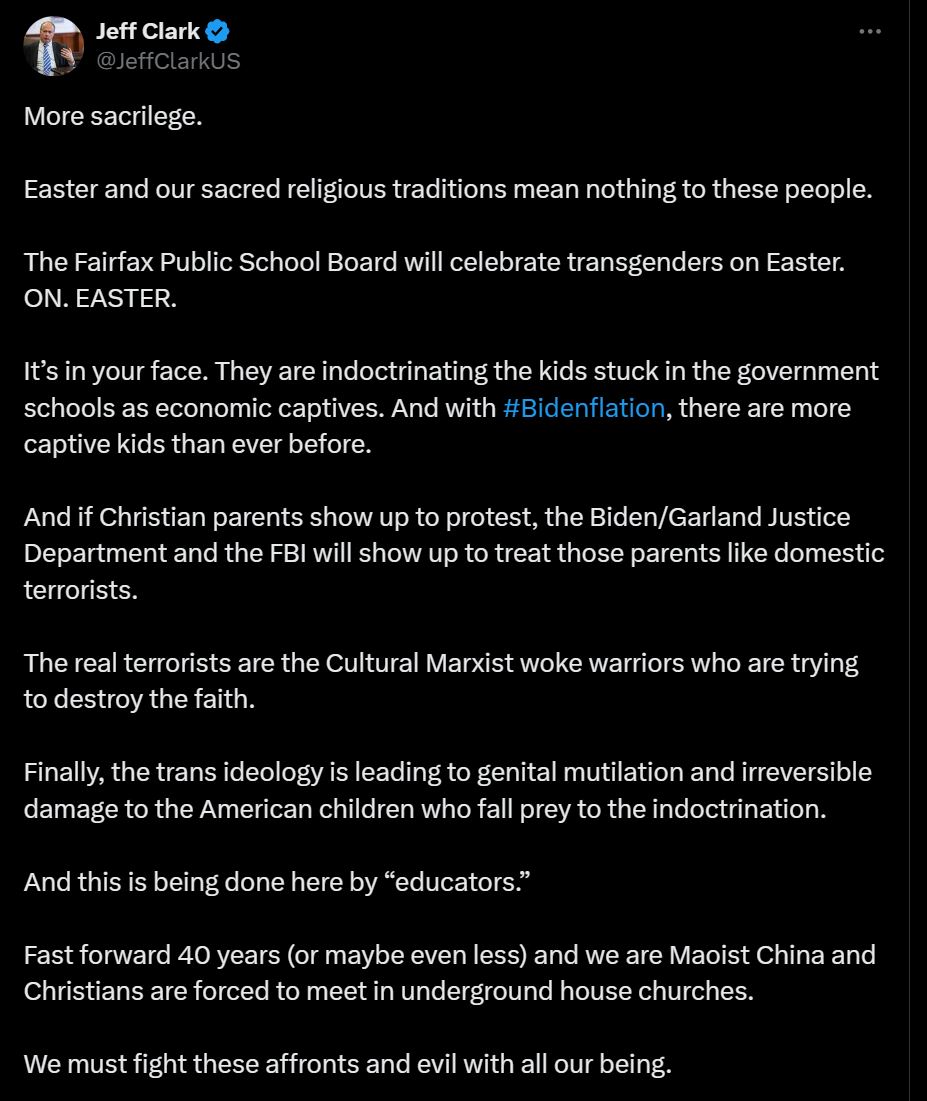 ⚖️ Today's focus for Jeff Clark: misplaced priorities. 🚨 Instead of fixating on non-threats like transgender & LGBTQ+ individuals, perhaps he should focus on the real risk: losing his law license. No #JeffClarkTrial at DC Bar tomorrow; Jeff opts out Good Friday." #JeffClarkTrial