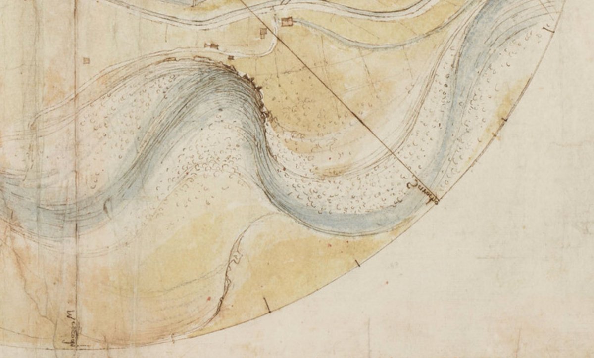 Mais là, Léonard de Vinci représente la ville d'un point de vue zénithal - pile poil vue de dessus. Et avec QUE des éléments géographiques (pas de monstres marins ou de bouches souffleuses par exemple)