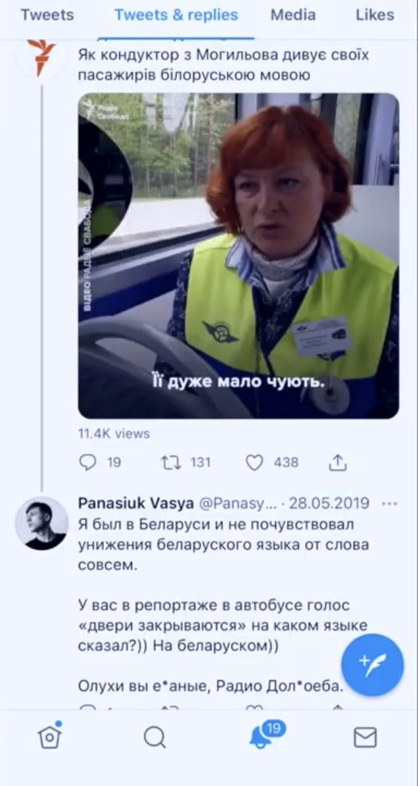 Б). Вася якось особливо не любить Радіо Свободу @radiosvoboda. Тут він коментуючи новину про малу кількість білоруської мови у Білорусі називає Радіо Свобода «олухами е#анимі. Радио Дол#оеба»…