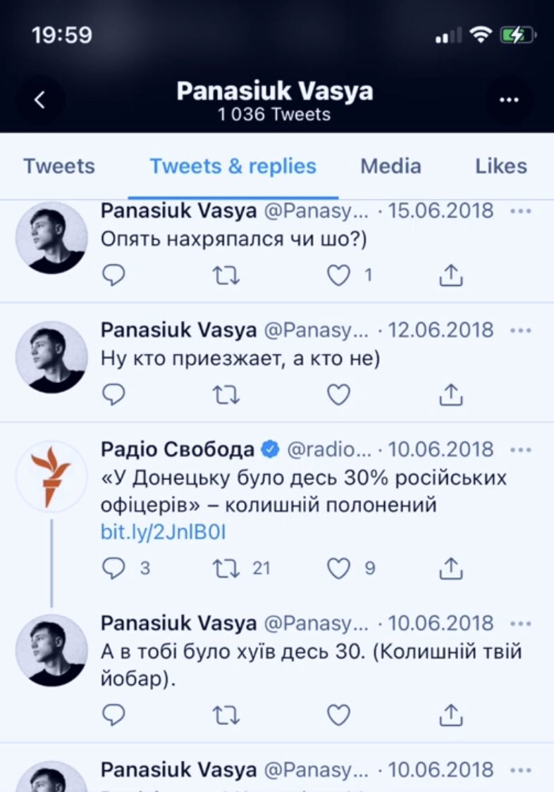 Нащо Васілій Панасюк, нинішній журналіст державного каналу ФріДом @FreedomNewsUA, коментує: «а в тобі було хуїв десь 30. (Колишній твій йобар)».