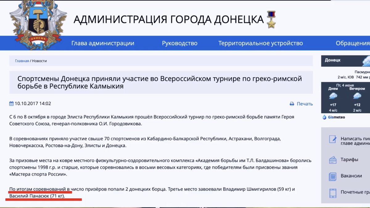 9. Ну, і на останок додам ще скрін з сайту окупаційної адміністрації Донецька який вітає Васілія Панасюка з зайнятим 3м місцем на змаганнях по боротьбі у Калмикії де Вася представляв маладую республіку днр.