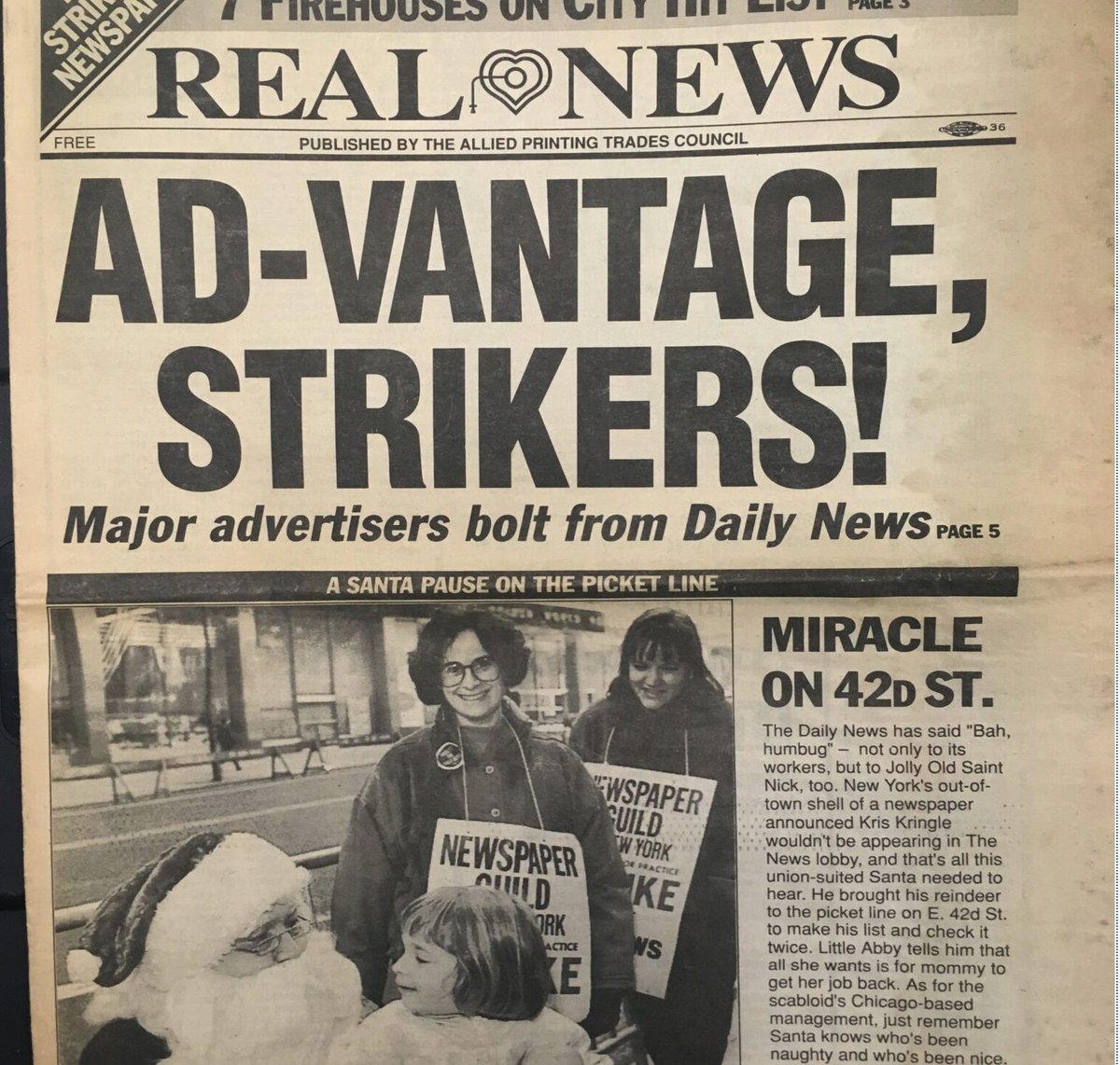 Story starts 1988-89. The Daily News is America's #3 paper with circ of 1.3 million. Parent company decides to bust its unions once & for all if it has to close the paper to do it. (1000s of corporate boards making this decision = why we have no manufacturing sector)