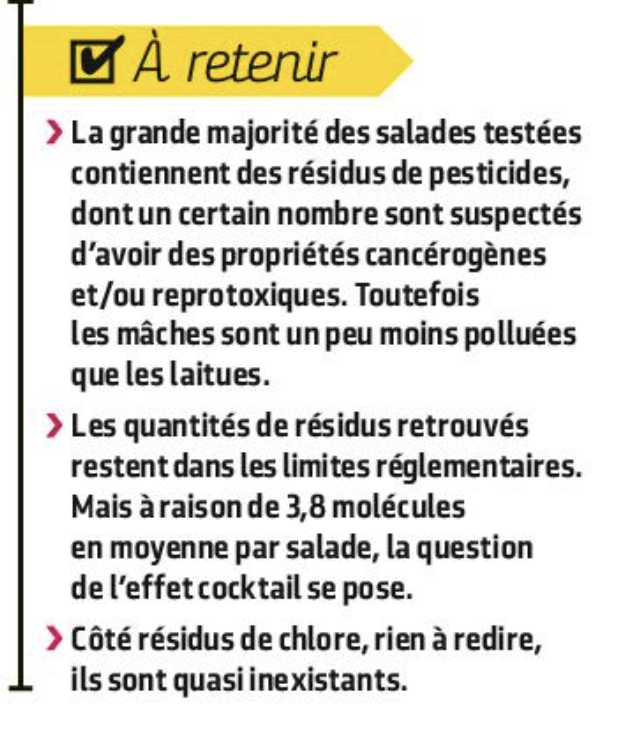 60 millions révèle juste avoir trouvé 28 molécules différentes, 3,8 par salade.