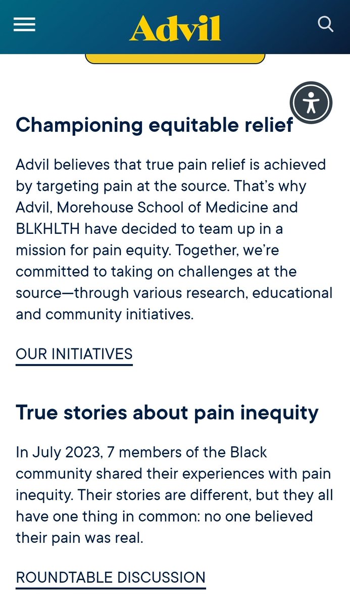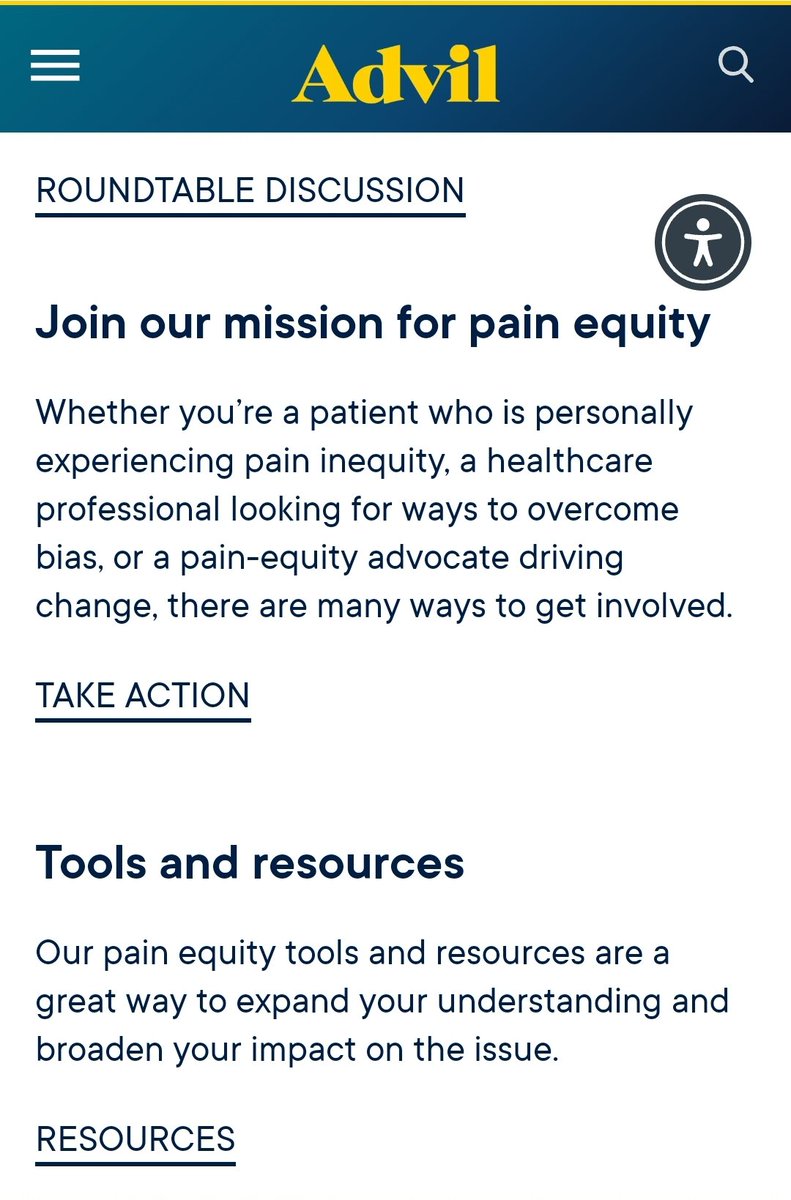 So, Advil really has a "pain equity project," like for real. Since "equity" means redistributing shares to make participants equal, this is downright alarming. Apparently, 3 in 4 black people *believe* there's a bias in how pain is treated. advil.com/thepainequityp…