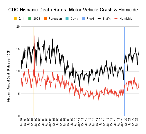 @whstancil CDC data shows the black death rate from both homicides and motor vehicle accidents went up during the Ferguson Effect of the first Black Lives Matter triumph and then both soared during the Floyd Effect of the second BLM Era.