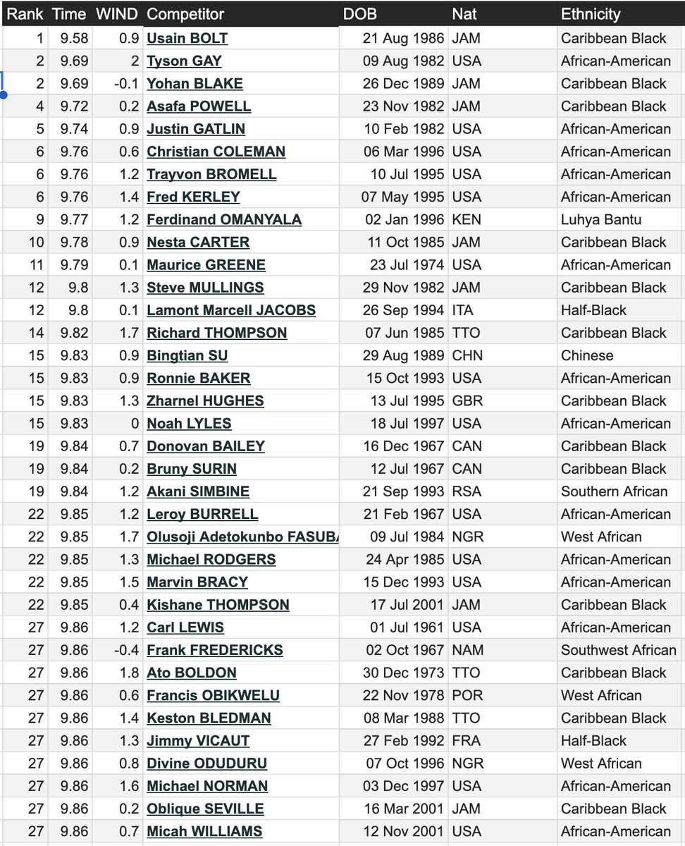 The all-time fastest marathoners as of today include: 1 Japanese, 1 black Brazilian, 2 North Africans, and the rest East Africans (46 Ethiopians and 44 Kenyans).