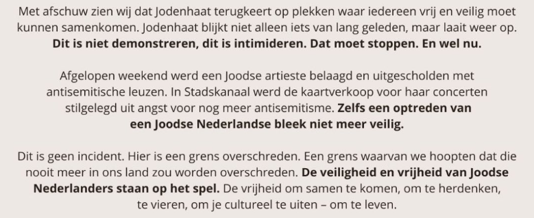 Of, nouja, we zijn het blijkbaar oneens. Dat JA21 deze verklaring mag onderteken is abject. Ik ben tegen antisemitisme, JA21 is tegen Palestijnen. Groot verschil.