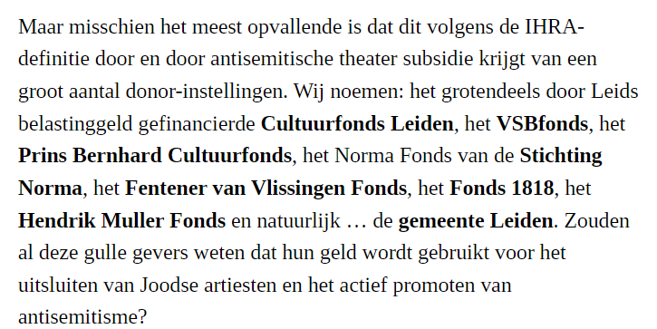 Dit valse frame is heel gevaarlijk. Zet druk op politici om inderdaad in te grijpen in de financiën van theaters, puur vanwege een politieke uiting die deze propagandisten niet zint.
