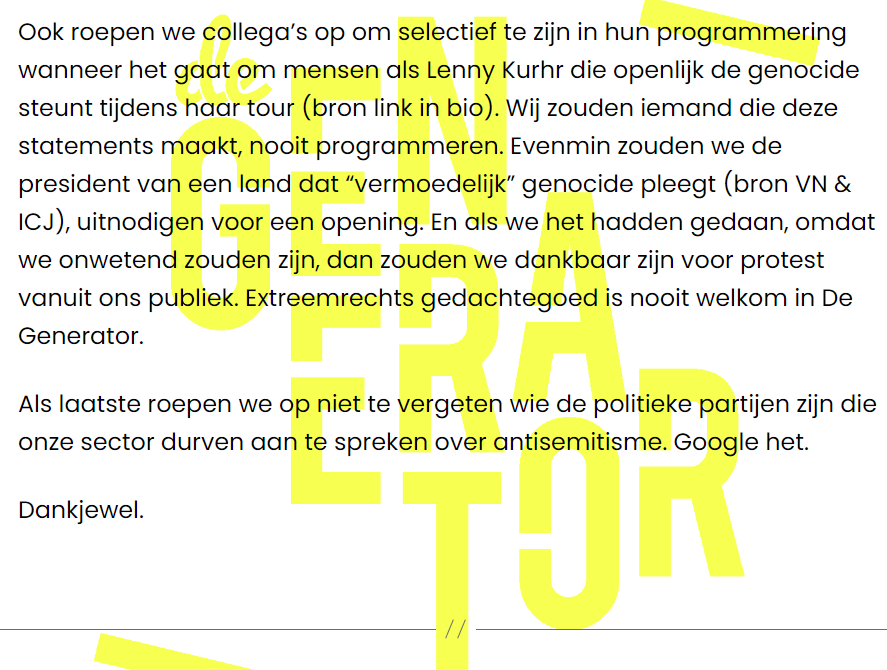 Het statement van de Generator kan je hieronder lezen. Het statement wijst erop dat het concert van Lenny Kuhr niet is verstoord omdat ze Joods is, maar omdat ze haar podium gebruikt om o.a. het Israëlische leger te verdedigen.
