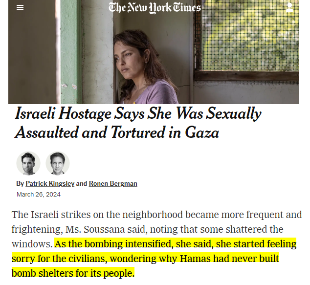 btw the NYT cites a "volunteer advising Amit Soussana", clearly involved in getting the story to press. She served as a top Israeli Netanyahu regime official. The NYT thinks this adds credibility to her story, instead of the opposite. It's all coordinated:
