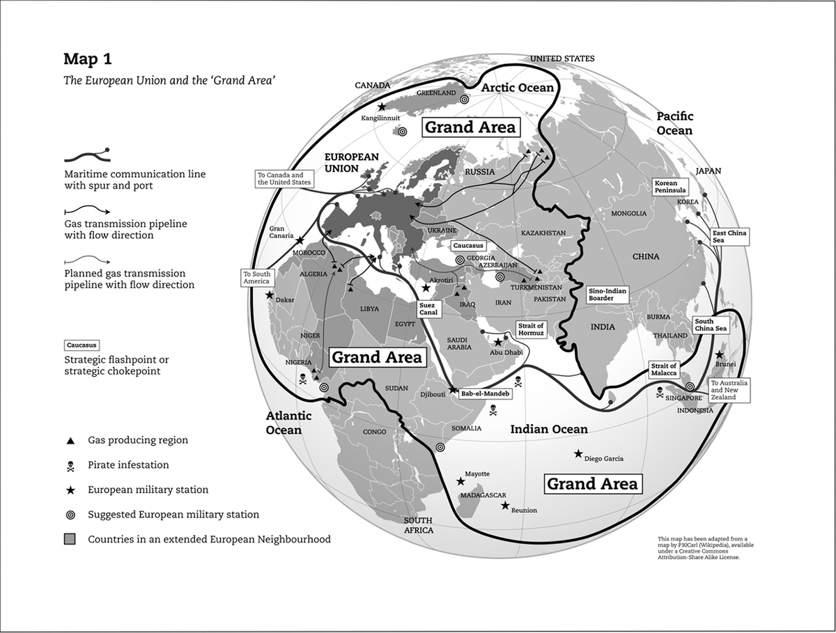 Das EU-nahe Egmont Institut definiert einen EU-"Großraum": „Die östliche Nachbarschaft und West-Russland, den Kaukasus und den Großteil Zentralasiens, die arktische Region, die nördliche Hälfte Afrikas, den gesamten Nahen Osten sowie den indischen Ozean und Südostasien“ 3/