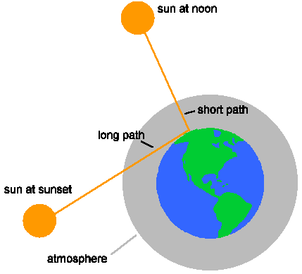 Mais quand le Soleil se couche, il devient rouge! C'est parce qu'au coucher de soleil, la couche d'air traversée par la lumière du soleil est plus épaisse. Il y a donc plus de diffusion.