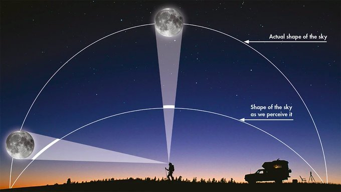 La première explication serait que le cerveau humain perçoive le ciel comme un dôme aplati, ce qui nous ferait croire que la Lune est plus grande quand elle se lève: on pense qu'elle est plus loin, notre cerveau la rend alors plus grosse.
