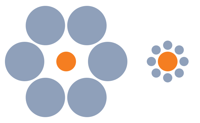 La taille des objets autour de ce qu'on observe (encore une fois les arbres, les maisons etc) peut tromper notre cerveau, c'est l'illusion d'Ebbinghaus. Les deux ronds oranges font la même taille.