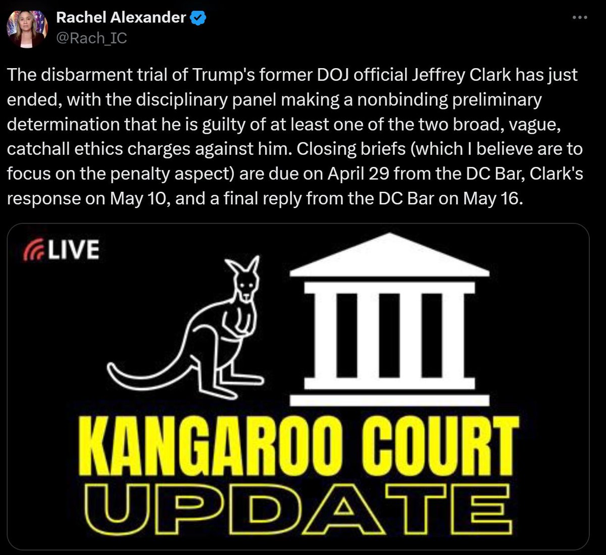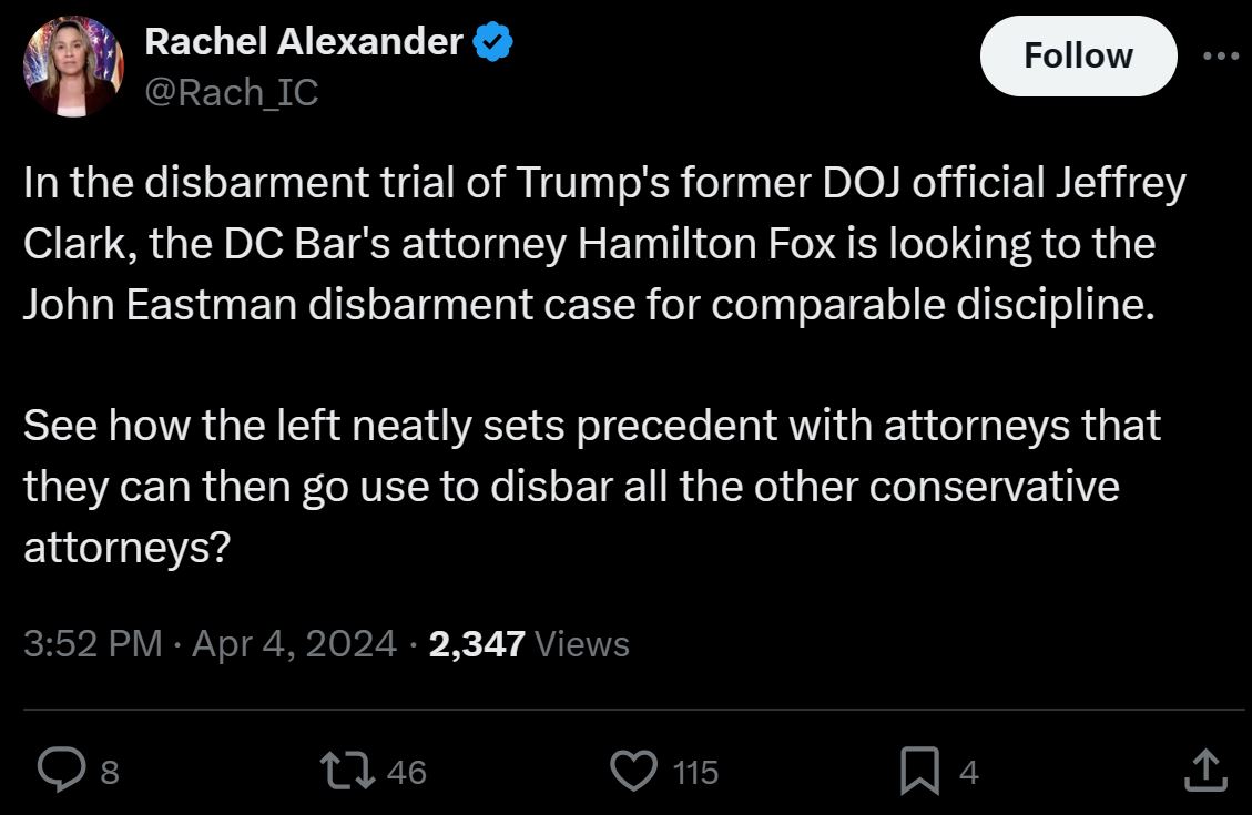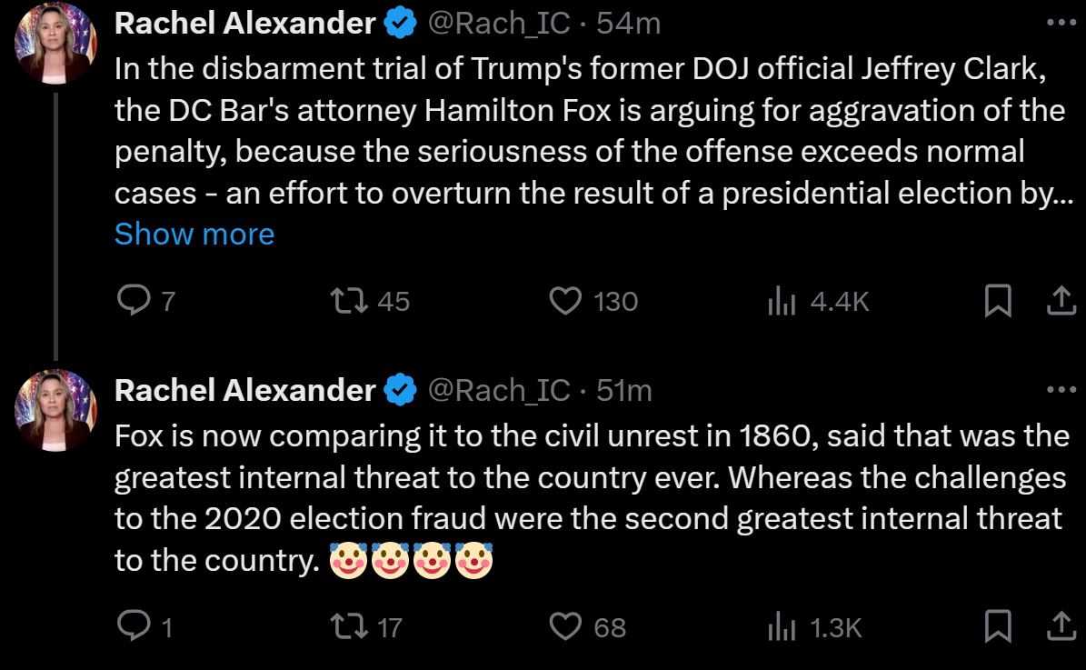 It's important to present both sides of #JeffClarkTrial. Suspended AZ lawyer and Ozempic withdrawal victim Rachel Alexander is taking this very well, putting aside partisanship as the objective journalist she holds herself out to be.
