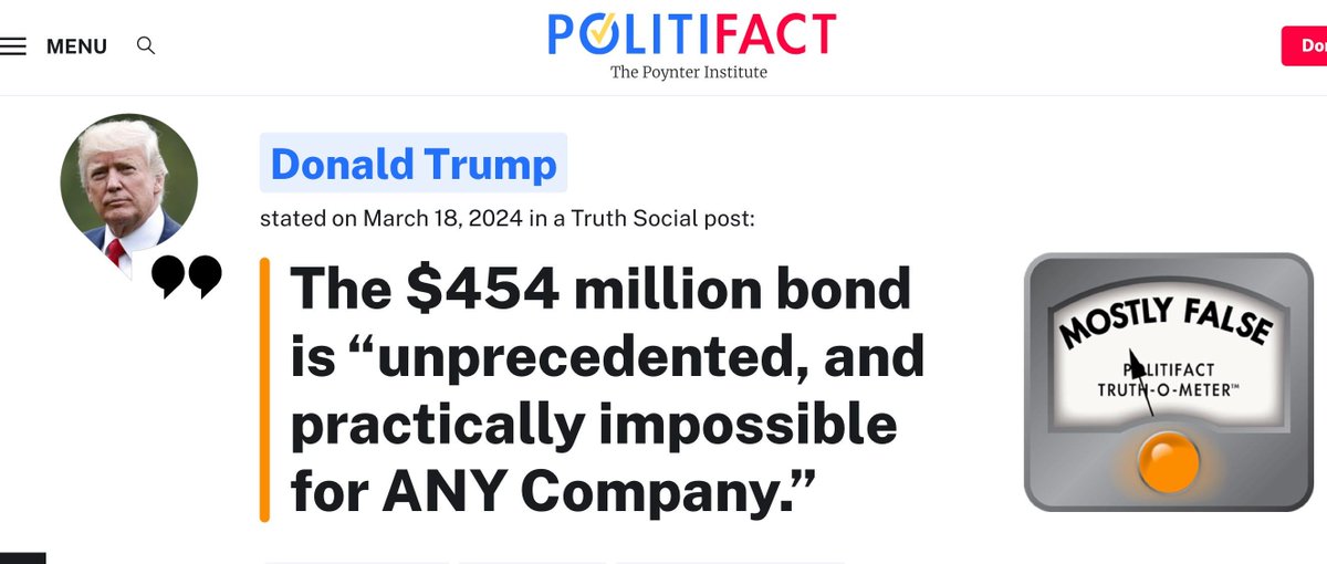 3/You’ll be stunned to learn that isn’t exactly true. Even Fox News told its audience it wasn’t the case. Politifact concluded companies have posted appeals bonds of $1 billion or more, 2x the surety Trump was to provide, altho more for large companies that family owned co's.
