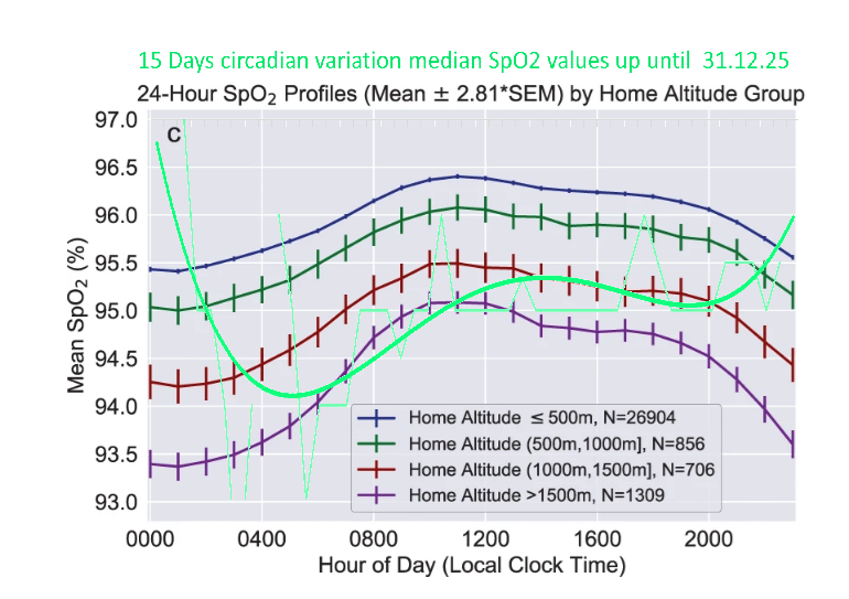 As the SARSCoV2 virus causes 'silent hypoxemia' it is no surprise that oxygen saturation is seriously disrupted. Here's a comparison to living at high altitude. Very relevant in Switzerland: Data samples vivosmart 5; median diagnostic values last 15 days 🍀: .nature.com/articles/s4174…