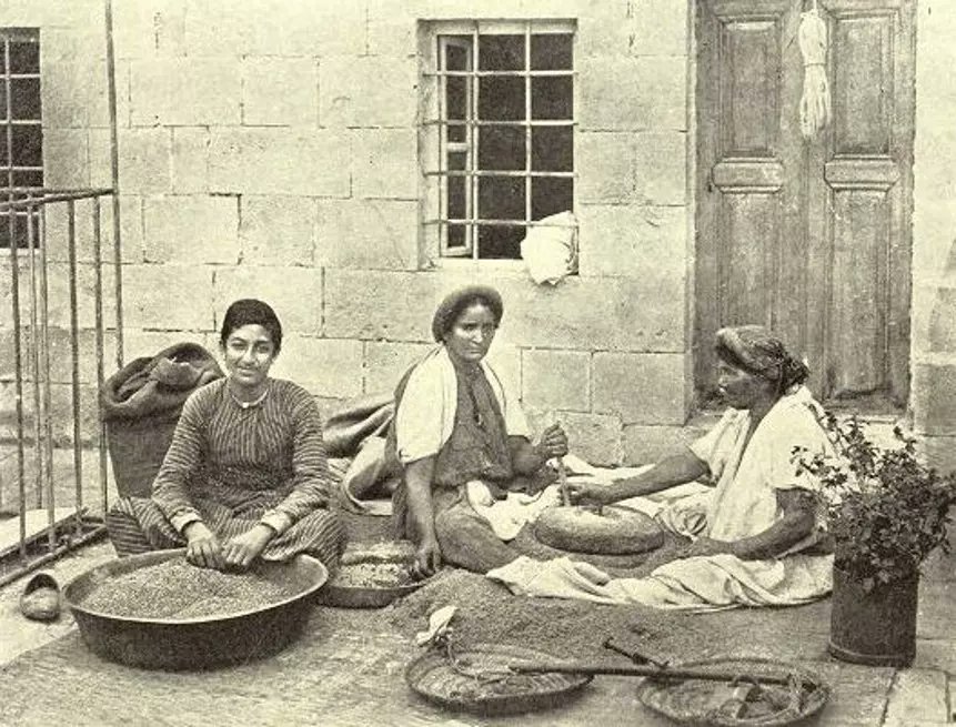 Women using hand grinders in front of a house, Ramallah - Late 19th, early 20th c.