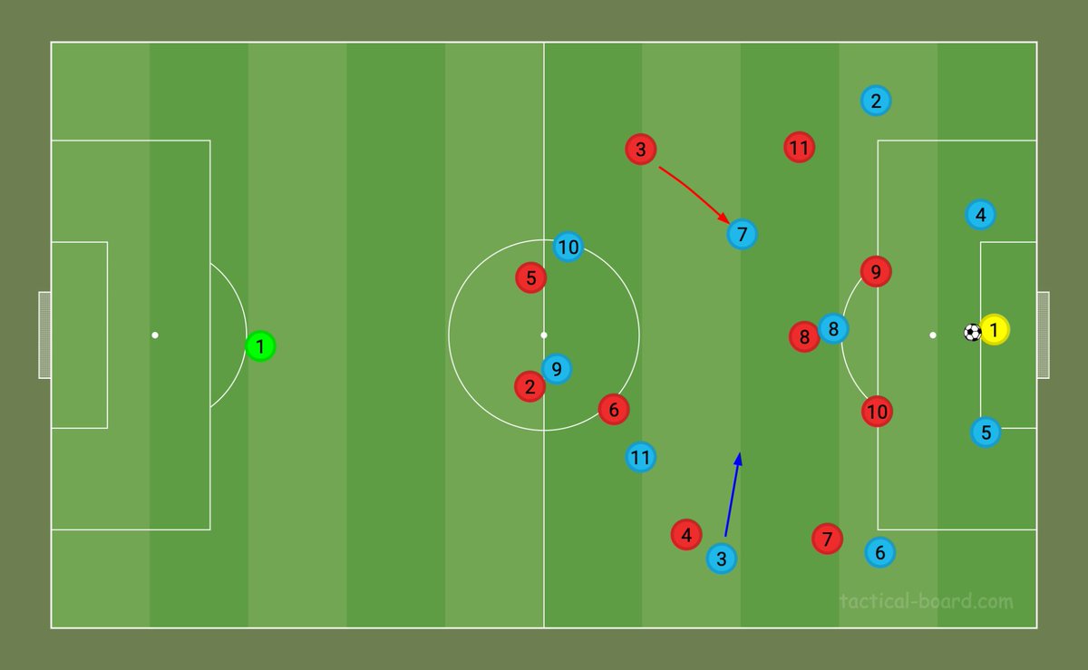 We can see an example of that here as their #9's into #10 type positions to create space in behind & 1v1 situations for the wingers in the last line.