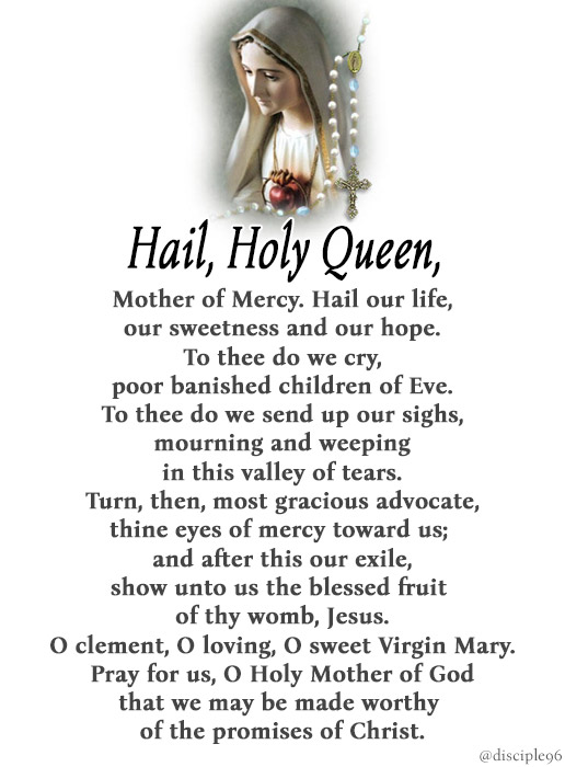 Hail, Holy Queen, Mother of Mercy, Hail, our life, our sweetness, and our hope. To thee do we cry, poor banished children of Eve…