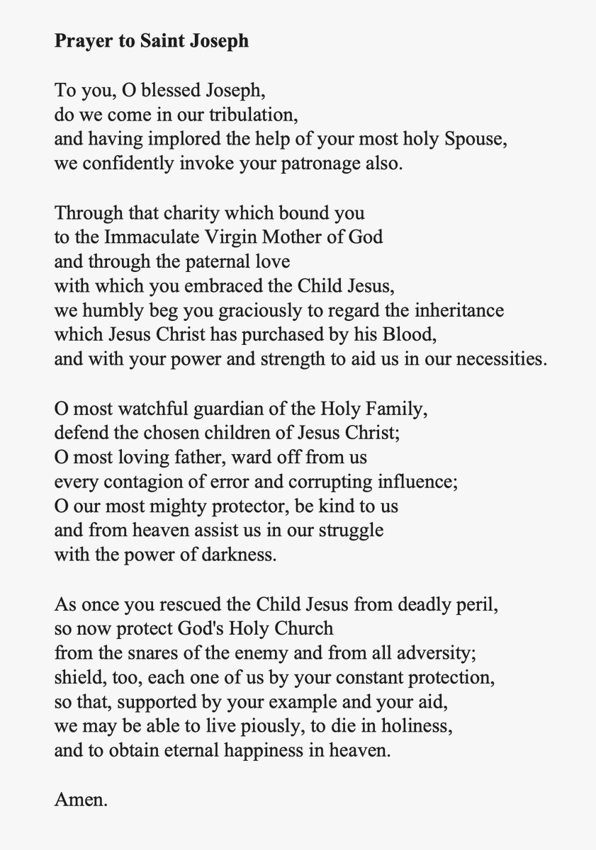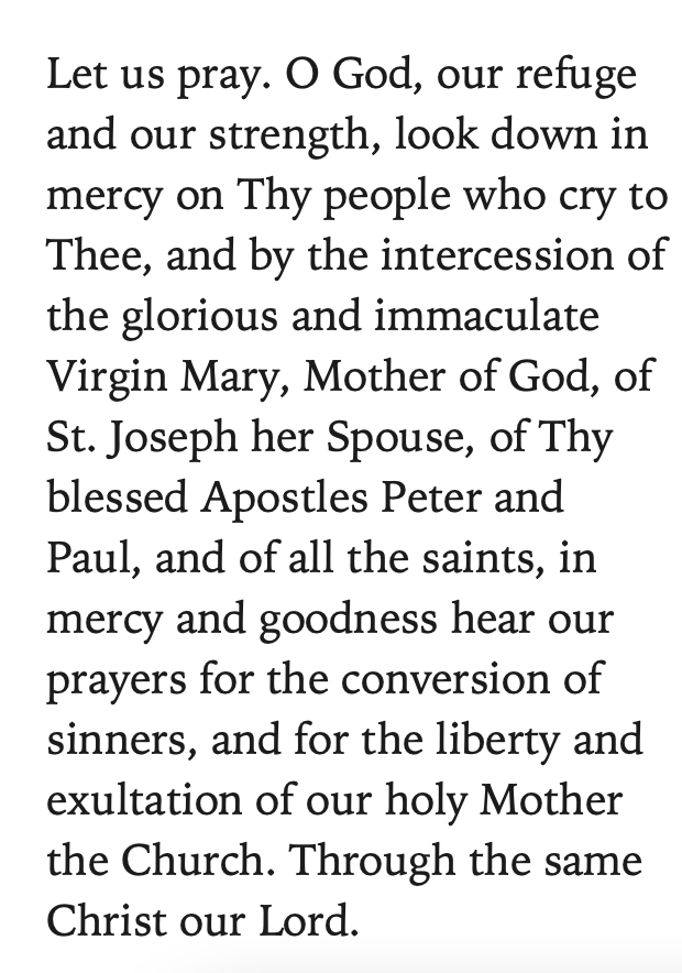 Let us pray. O God, our refuge and our strength, look down in mercy on Thy people who cry to Thee, & by the intercession of the glorious & immaculate Virgin Mary, Mother of God, of St. Joseph her Spouse…