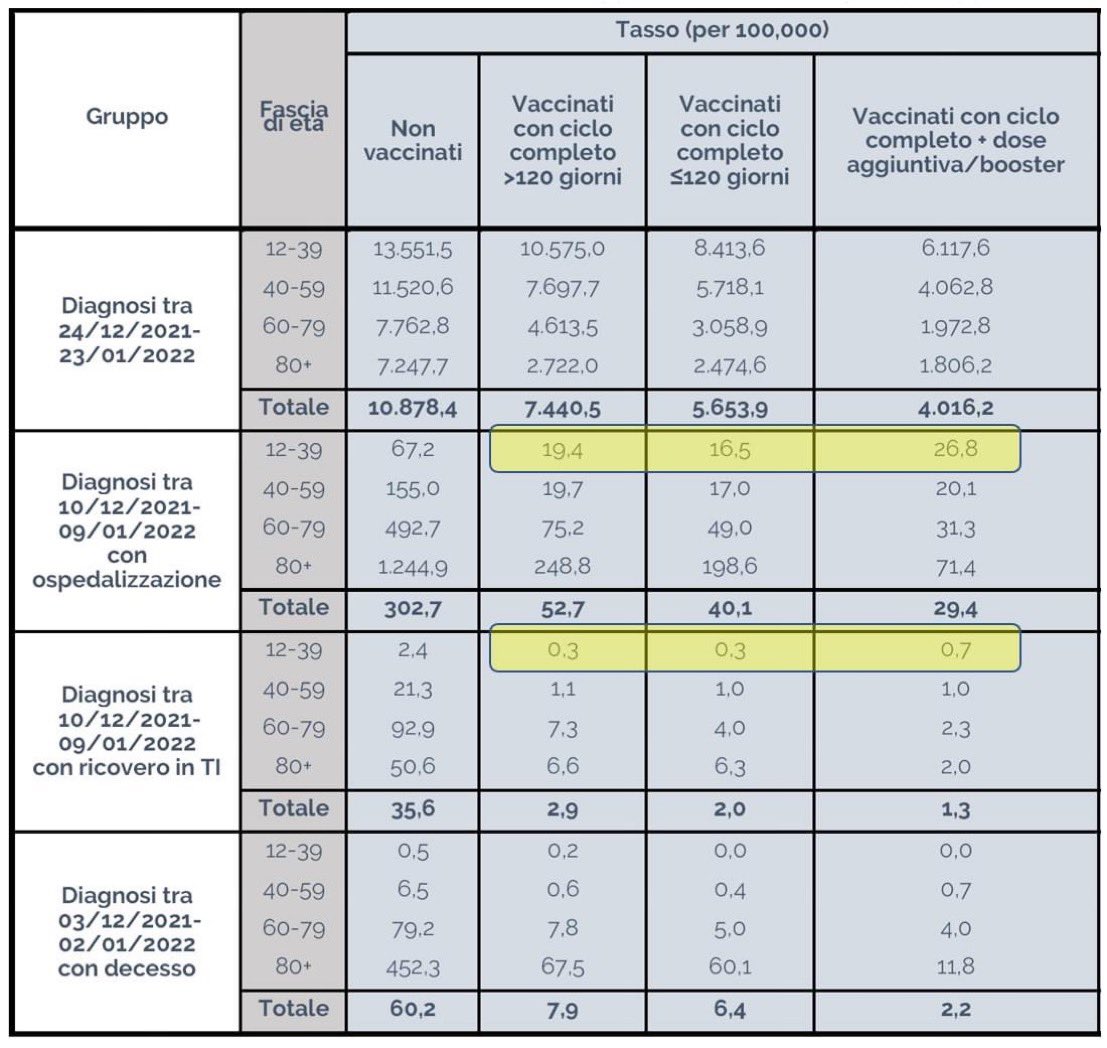 Anche il Bollettino dell’Istituto Superiore di Sanità evidenziava a inizio febbraio 2022 che chi, nella fascia tra 12 e 39 anni, aveva fatto la terza dose rischiava di più l’ospedalizzazione e il ricovero in TI. 10/
