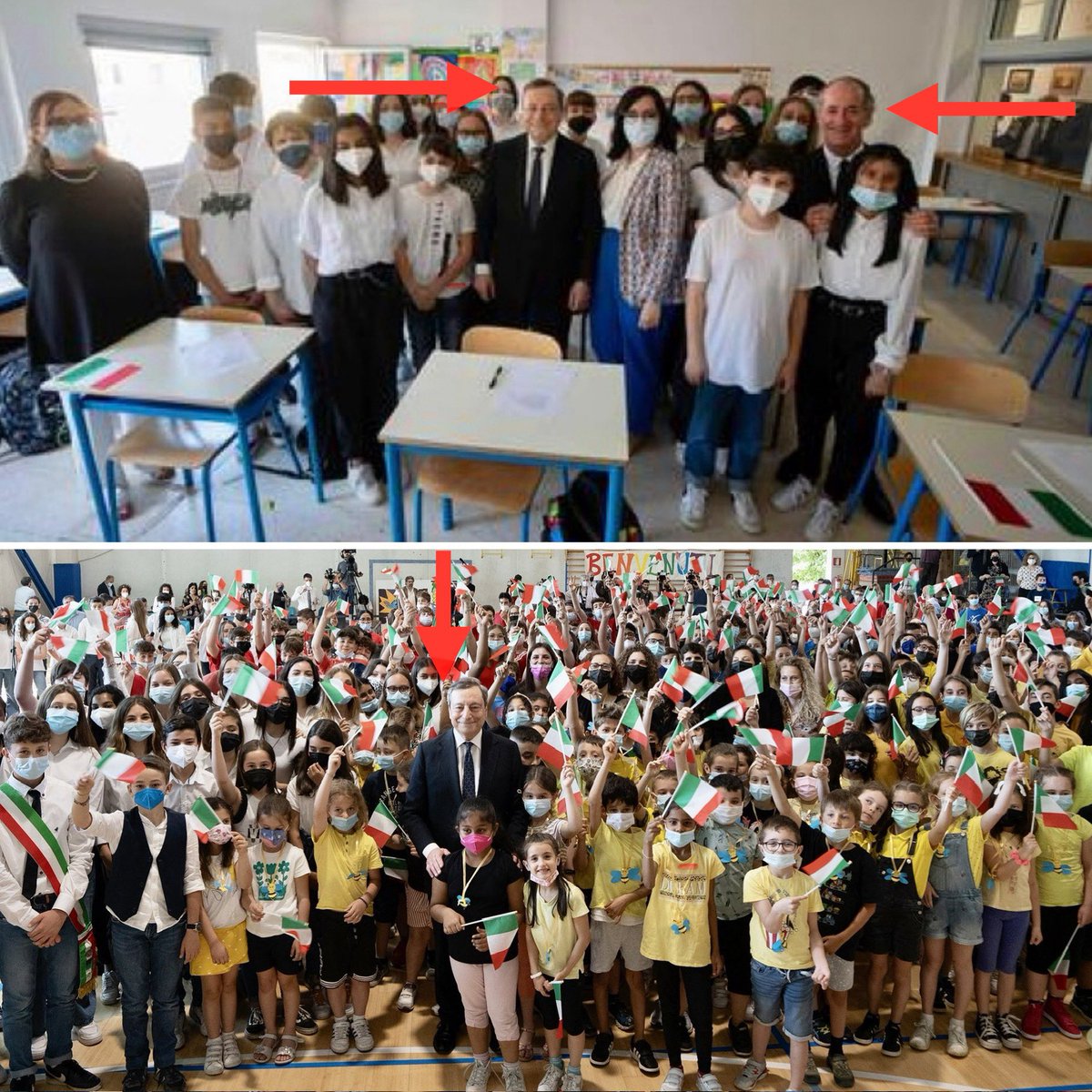 Il livello più basso è stato raggiunto quando nel 2022 i politici italiani incontravano, senza la mascherina, studenti obbligati a portarla: nelle foto il presidente Draghi in una scuola e con Zaia, la sottosegretaria all’istruzione Floridia, Bianchi, Boschi e Colao. 25/
