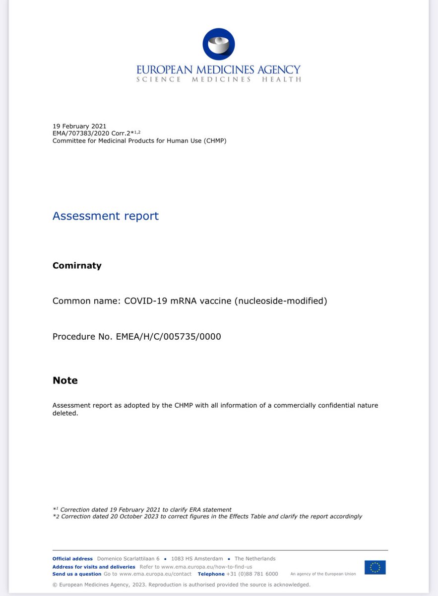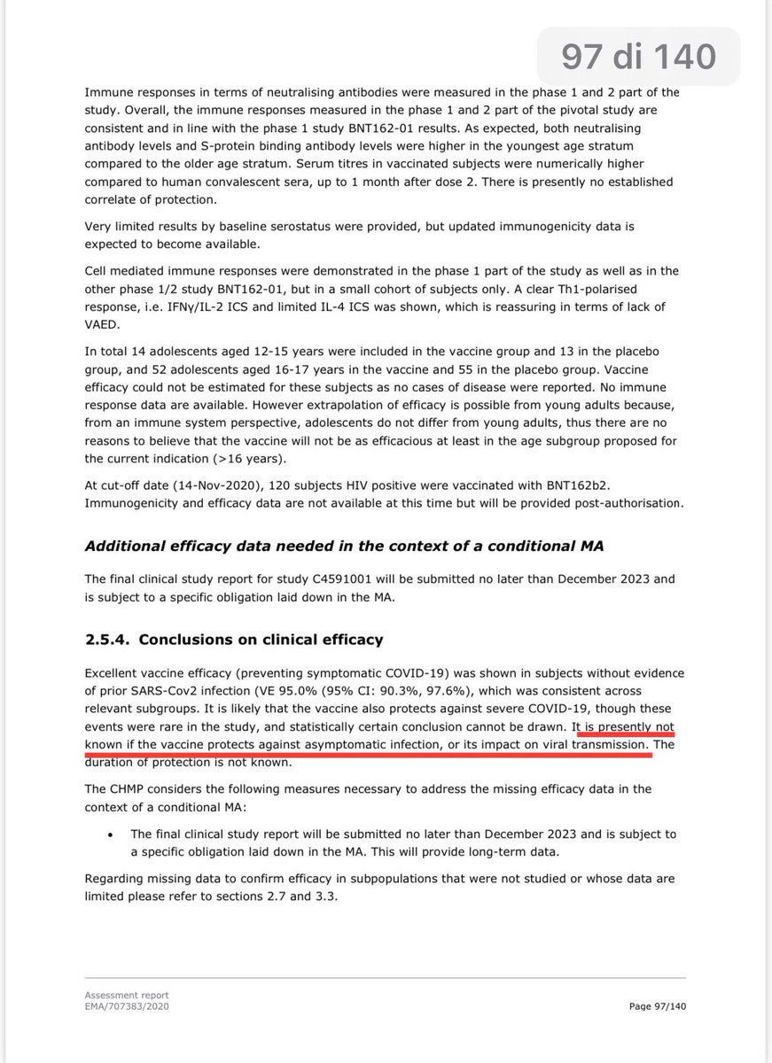 Ancora a ottobre 2023, rispondendo a un eurodeputato, Ema ribadiva ancora una volta che “i vaccini contro il Covid-19 non sono stati autorizzati per prevenire la trasmissione, le informazioni sul prodotto affermano chiaramente che i vaccini servono ‘per l’immunizzazione attiva per prevenire il Covid-19’, e i rapporti Ema rilevano la mancanza di dati sulla trasmissibilità”.