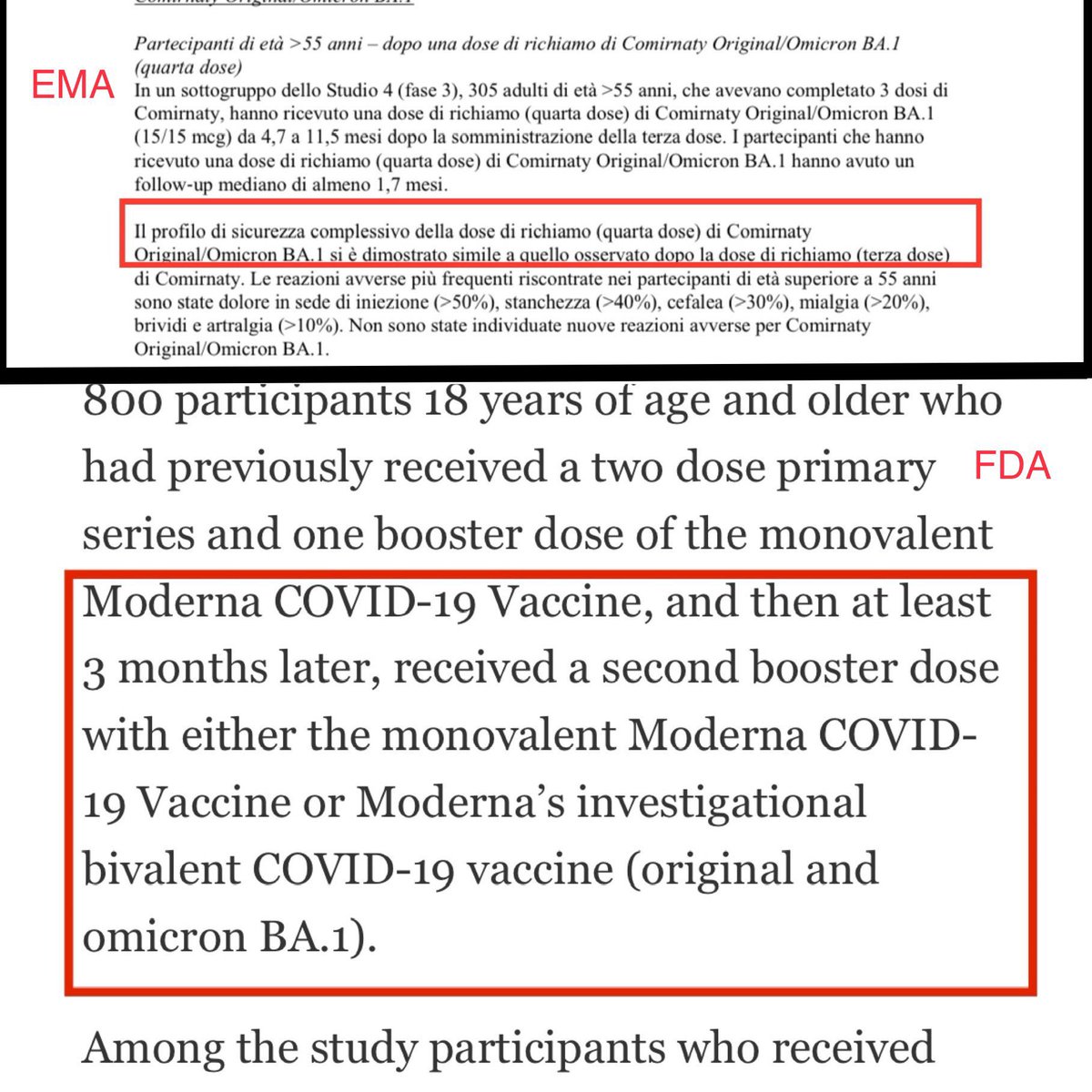 30/ La cd. “quarta dose” sponsorizzata da Speranza era solo l’ennesimo richiamo con il “vecchio” vaccino. Il 1/9/2022 Ema ha “raccomandato” l’autorizzazione per il nuovo bivalente Ba.1 chiamandolo “4a dose”. Anche secondo Fda la quarta dose o “secondo richiamo/booster” era quella con il nuovo vaccino aggiornato Ba.1 e non quella sponsorizzata da Parisi per conto di Speranza.
