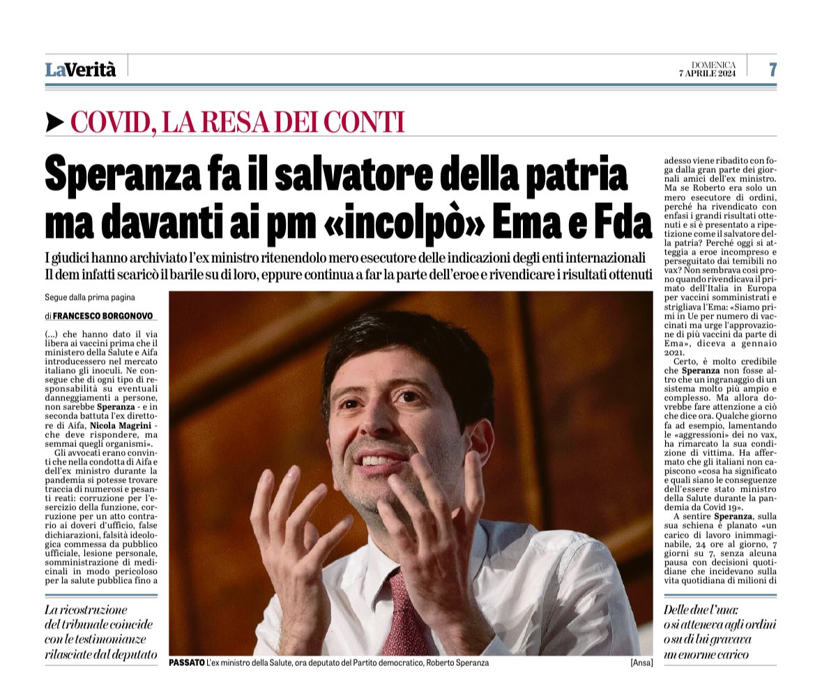 “Nelle motivazioni del Tribunale dei Ministri sull'archiviazione della denuncia contro Speranza e Aifa non si negano effetti avversi e danneggiati”, spiega Zambrano, “ma si dice che l'ex ministro non ha colpe perché c'era stato il via libera di Oms, Ema e Fda”. 6/ @zambry77
