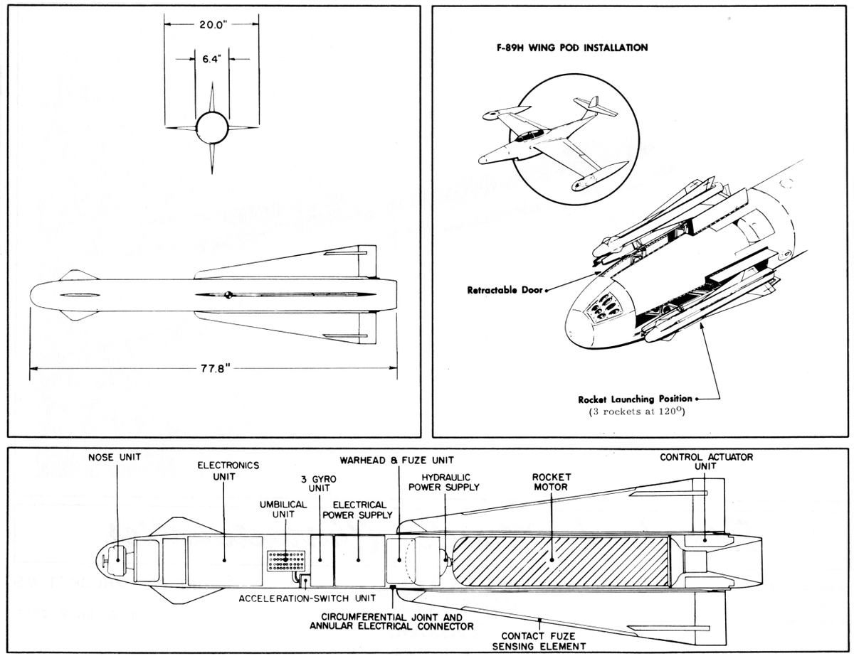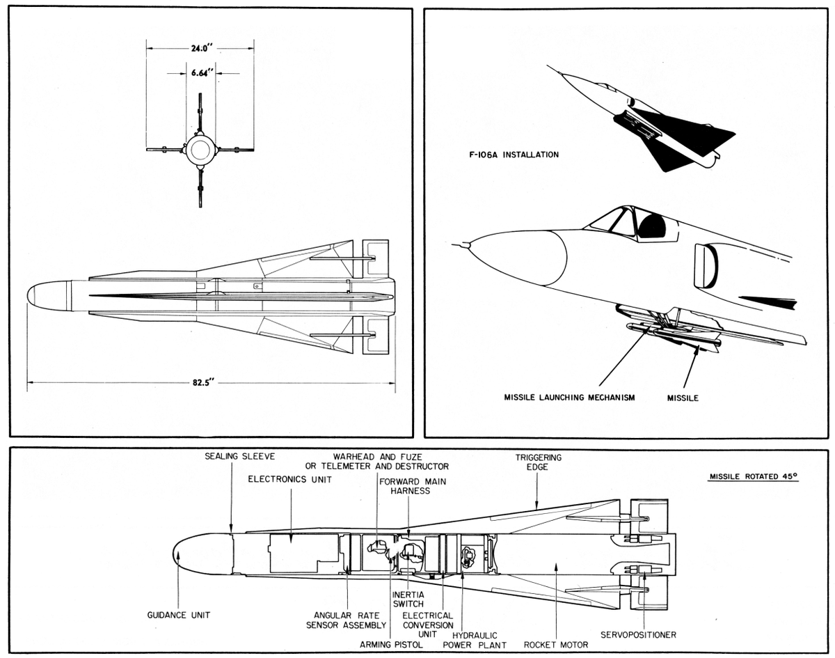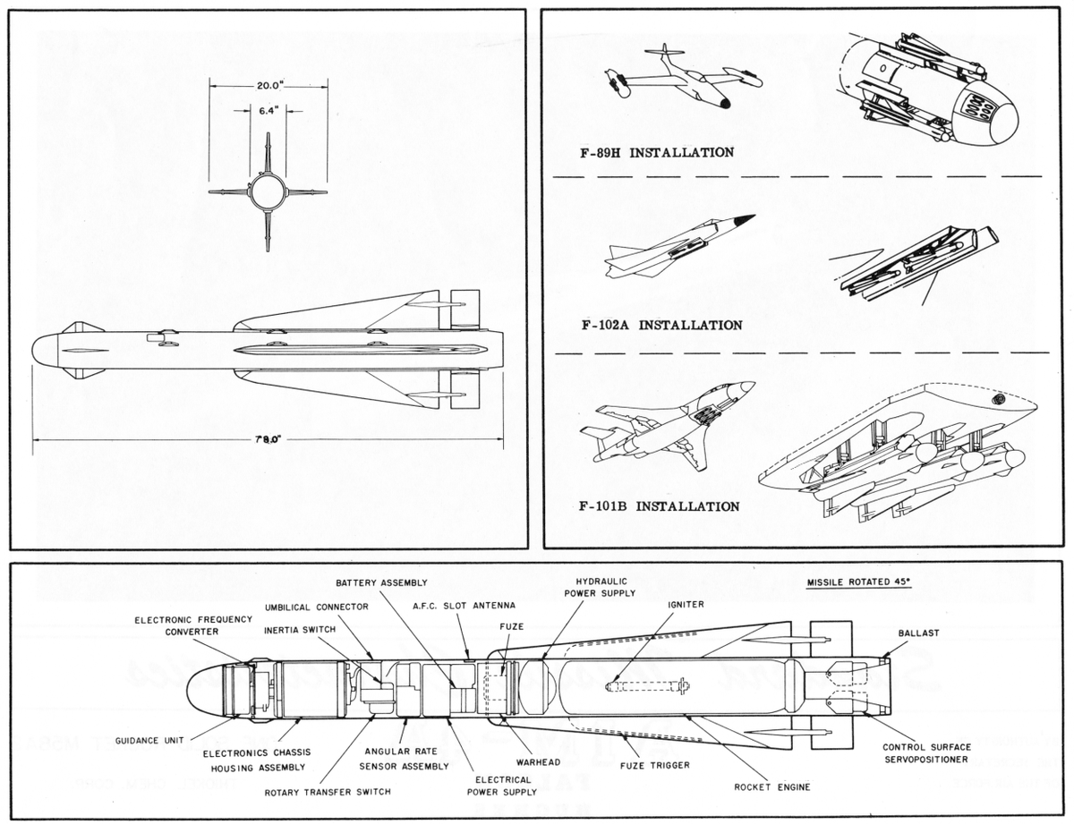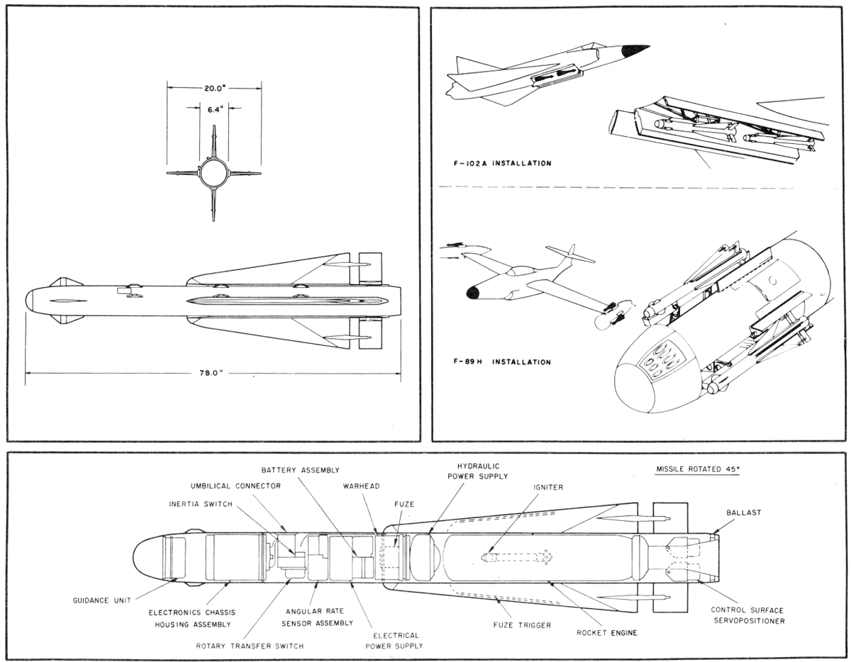 Now, the first one: GAR-1, or Guided Aerial Rocket-1. GAR-1(AIM-4) was the first Hughes Falcon, developed for use on the Northrop F-89H. This was a semi-active radar-homing missile, which used a gyro-stabilized radar antenna to track the target and produce steering corrections.