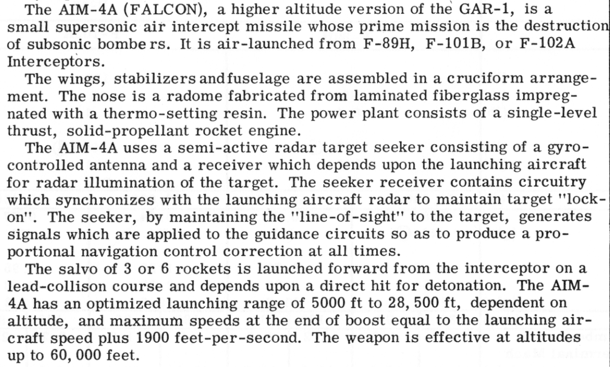 This would lead the the Falcons that would stay in service until 1988: the GAR-3A and GAR-4A, the AIM-4F and AIM-4G respectively. These would enter service in 1959.