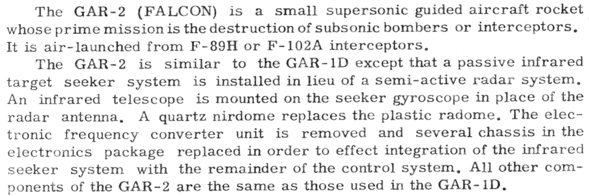 The GAR-2's seeker, however, was rear-aspect only, operating in the range from 1.8-2.7 microns--the exact same as the early AIM-9B Sidewinder!