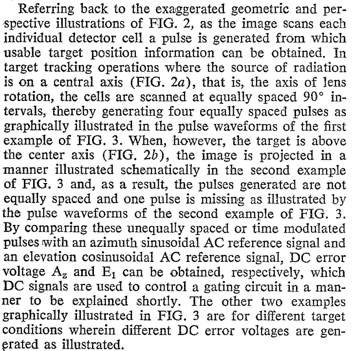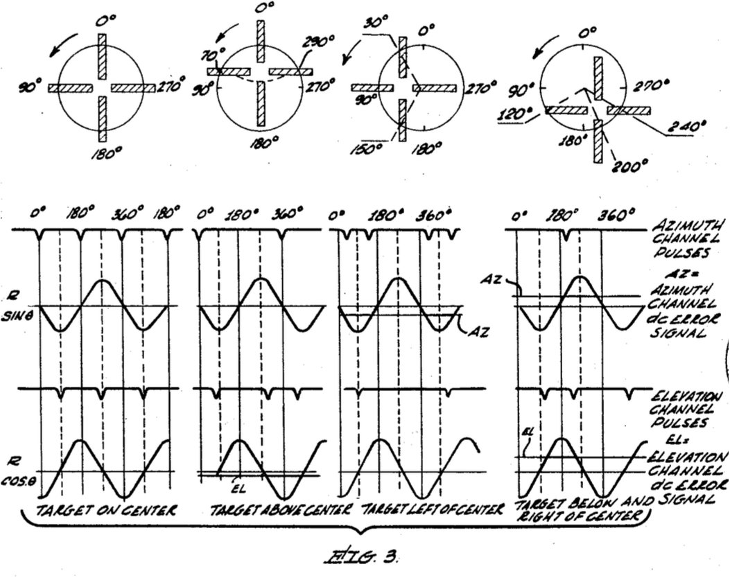 Given this fixed angle, when the radar dish spun, it would draw a small circle, and when a target was not centered, the return strength would be higher. Based on this return's position, the guidance electronics would determine the angular error and produce steering corrections.