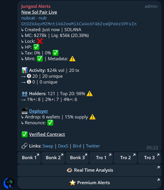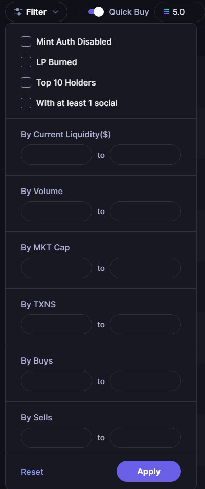 to see new pairs i use , specifically ''Solana New Pairs'' to see new pairs going live. t.me/thejungool