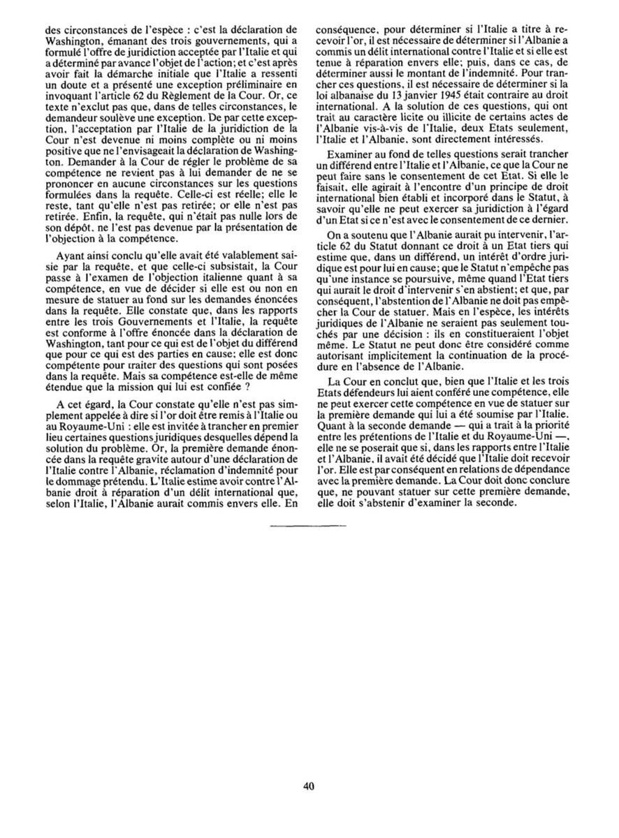 @GermanyDiplo @UNRWA 12. Concernant l'admissibilité, dans l'Affaire de l'Or Monétaire en 1954, la CIJ avait conclu qu'elle ne pouvait pas statuer sur une question affectant les intérêts de tiers qui "seraient non seulement affectés par une décision, mais constitueraient l'objet même de la décision".