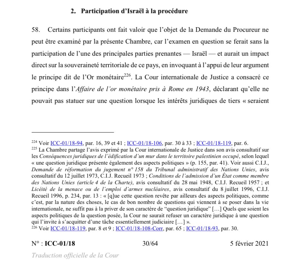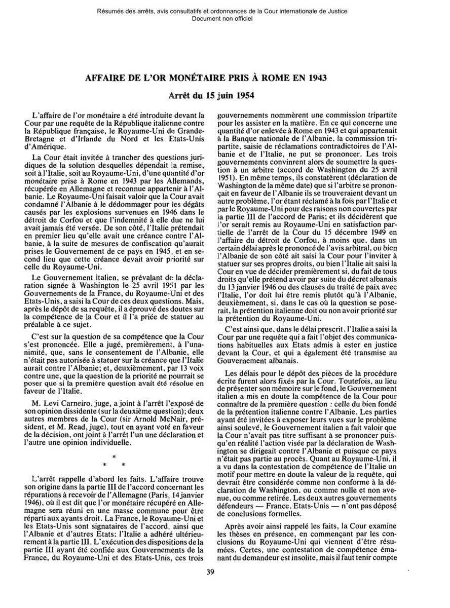 @GermanyDiplo @UNRWA 17. Il est à noter, en outre, que le principe de l'Or Monétaire a déjà été rejeté par d'autres juridictions, par exemple par la CPI lors de sa décision concernant le territoire de la Palestine. Cependant, il est question ici de la CIJ. Va-t-elle réviser sa jurisprudence ?